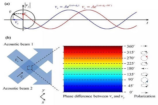 研究者在相互垂直的声波干涉场以及声栅波导中传播的渐逝波中观测到了声波自旋。在垂直相干的声波中,每束声波贡献了局域速度场中的一个垂直分量,局域速度场矢量即为声波的偏振。当局域速度场的两个垂直分量相位相差90度时,该声波的偏振发生旋转,从而导致了声波的自旋(如图所示)。更进一步,研究者利用这一声波自旋产生了遥控粒子旋转的力矩。