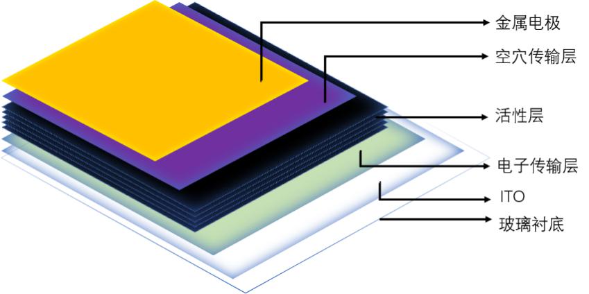 器件结构形似三明治,具有光电效应的活性层被电子传输层和空穴(电子跃迁后形成的局部缺电子部分称为空穴)传输层夹在中间,两端为电极材料,一般是金属和氧化铟锡(ITO)。