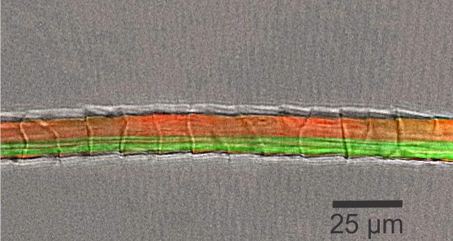 染色显示纤维状的正皮层细胞(橙色)和副皮层细胞(绿色) 图源:AgResearch Ltd https://www.abc.net.au/cm/lb/9568412/data/microscopic-fibre-data.jpg