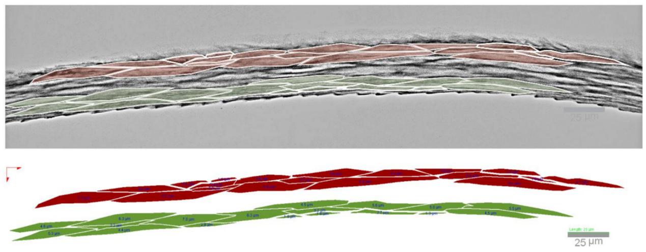 红色为正皮质层细胞,绿色副皮质层细胞,在多数情况下,正皮层细胞比副皮质层细胞要长。图源:文献2