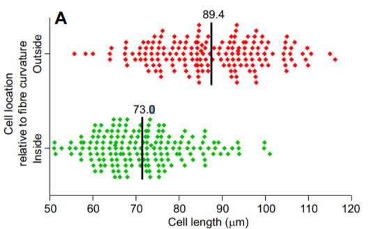之后,这些纤维被切成均匀的碎片,利用静电力把它们移动到载玻片(一种玻璃片)上,对这些样本的片段进行染色,最后在显微镜下观察。测量出每个纤维的平均曲率,然后放大到曲线上精确点的细胞结构。