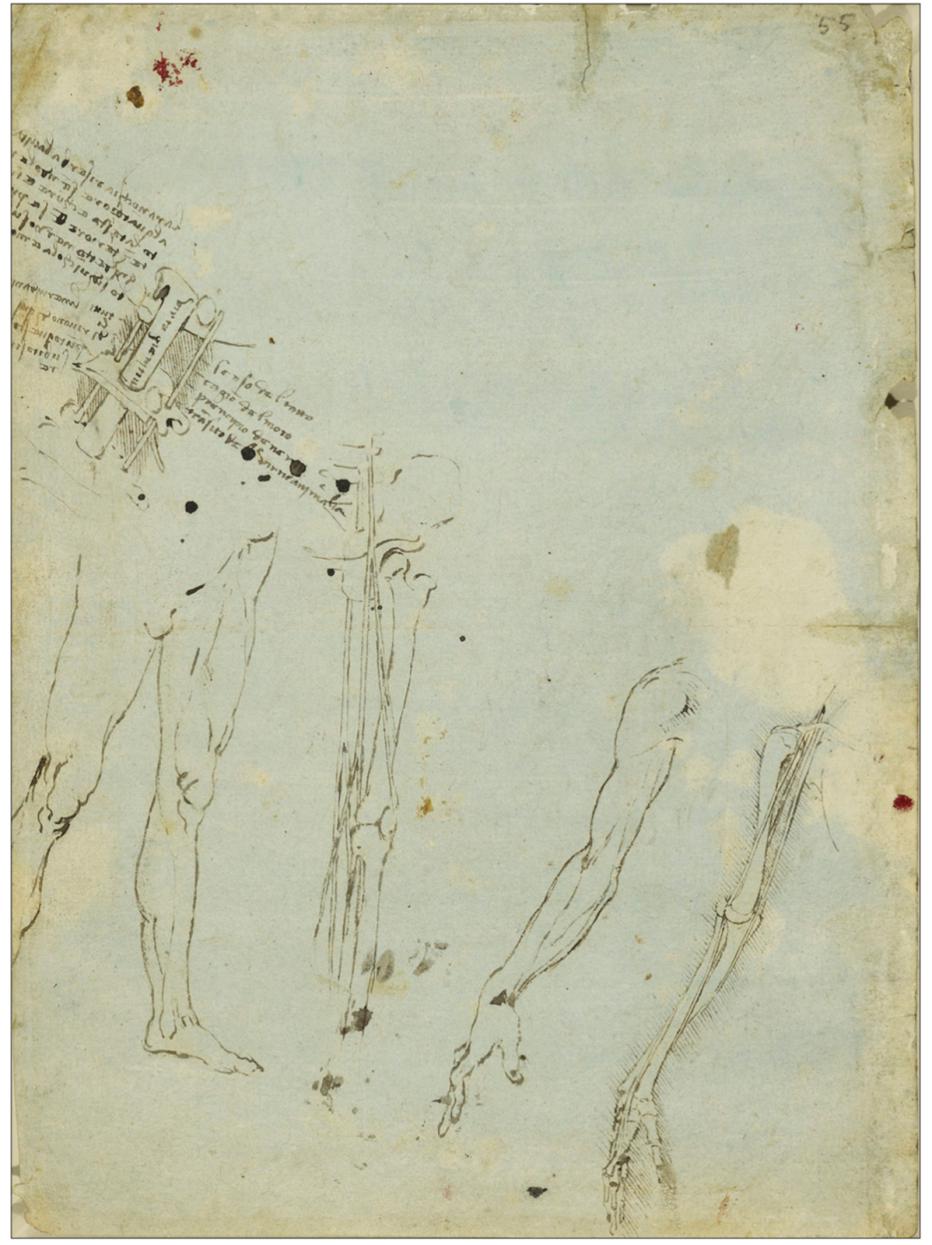 达芬奇手绘的被刺毁脑脊髓的青蛙的脊柱。左上是颅骨底部与穿过枕骨大孔的脊髓部位分解图。沿着脊髓上的文字标记着“原动力”(译)。脊髓左边的是达芬奇常用的镜像文字,右边文字罕见的以正常方向书写,包括“触觉,运动之起因,神经之起源,动物力量之通道”。下面一排图示描绘了腿部、手臂和骨头的周围神经[1]。
