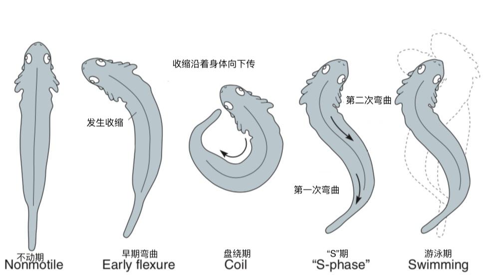 图说:蝾螈胚胎的行为发育过程。从简单的一侧弯曲到最终复杂的游泳行为,整个过程需要多种类型神经元的发育形成、简单环路的建立与整合[3]。