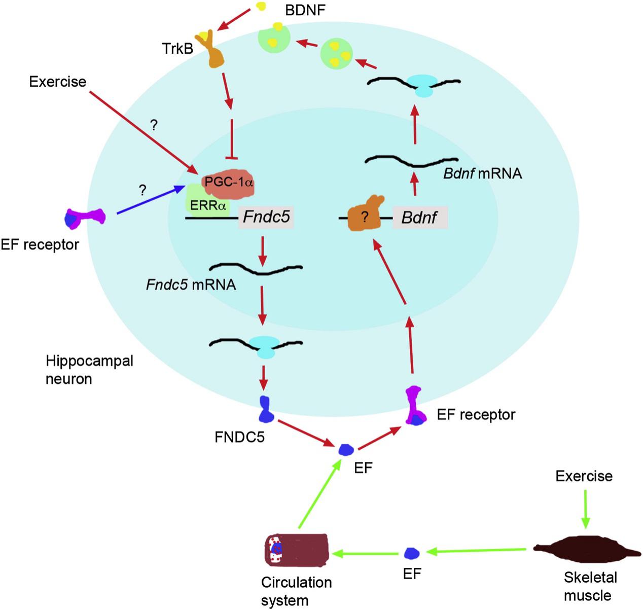 海马中调控运动引起的Bdnf基因表达的生化途径[11]。红色箭头的途径:运动以未知通路增加了海马神经元中PGC-1α的表达,增加的PGC-1α同时引起其结合伴侣ERRα的表达,继而增加FNDC5的表达;FNDC5作为I型膜蛋白,其水解产物运动因子(Exercise factor, EF)被释放到胞外基质;运动因子EF可能与其受体结合,以自分泌或旁分泌模式激活一种未鉴定的信号级联,引起Bdnf的表达。绿色箭头途径:运动因子EF同样在肌肉中产生并循环至全身。蓝色箭头途径:在循环系统中的运动因子EF可能激活海马神经元中PGC-1α的表达,进而增加FNDC5的表达,形成EF放大环路。