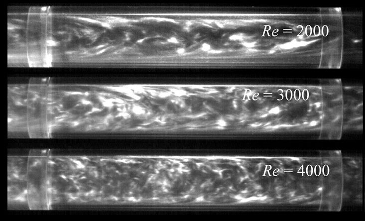 湍流的产生:最上面的图片显示了一个单一的股流结构的图像,雷诺数为2000(低于开始产生湍流的值)。随着雷诺数的增加,空间结构尺度减小。源于:曼彻斯特大学的乔治·培新豪和托马斯·穆林。