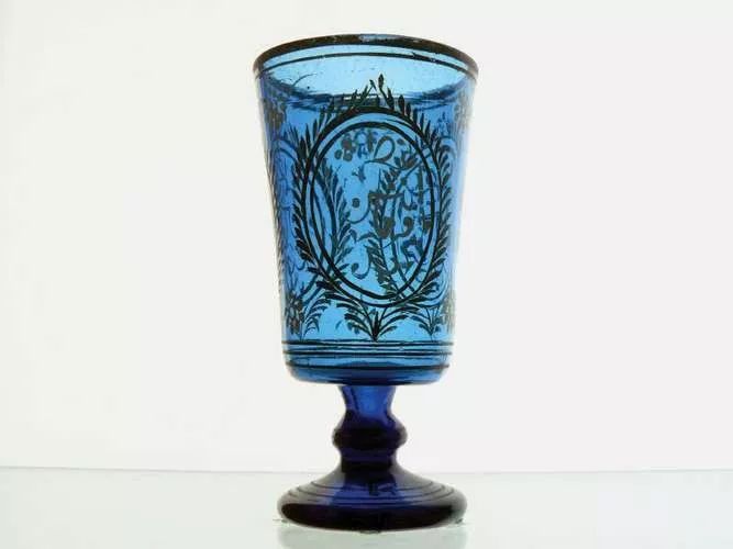 带有白色和金色珐琅装饰的蓝色玻璃酒杯,纽约布鲁克林博物馆