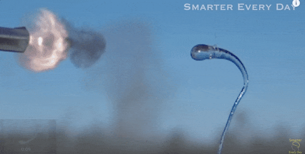 但是其原理其实很简单。当熔融的玻璃碰到水,外层会很快冷却,而内层仍保持熔融状态。热膨胀的作用使液体在变热时膨胀,在冷却时收缩。这意味着内部的熔融玻璃正试图在冷的外层向内收缩的同时膨胀。当整个过程结束时,这些相等的推拉力会在一条长链中累积,该长链从液滴的头部延伸到尾部。水滴冷却后,便会锁定在这种高张力状态下 [4]。有人会把它比作一个拱门:它的坚固程度令人难以置信,但是如果它的任何一部分损坏了,整个鲁珀特之泪就会破碎。不过这需要在高速相机上才能看到。