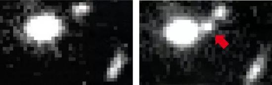 这两张图片,源自佩尔穆特团队1995年的一次观测。右图箭头所指的亮点,代表了一颗Ia型超新星。