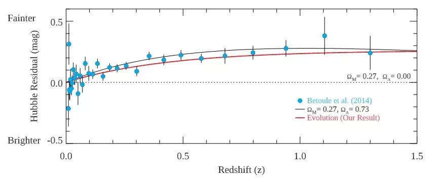 在最新研究中,作者也验证了这种可能性:如果暗能量真的不存在,通过恒星亮度随年龄的演化,也可以模拟出类似的亮度-红移曲线。