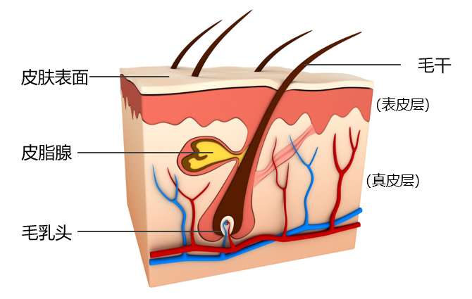 不管是头发还是汗毛,人体毛发主要由角质蛋白组成,约占总重的97%。这些角质蛋白由毛囊下部的毛母质细胞中合成并分泌。在毛发生长过程中,毛囊通过毛母质包围的毛乳头中的毛细血管,将营养物质源源不断地输送给毛母质细胞,然后固定到毛发(毛干)里。