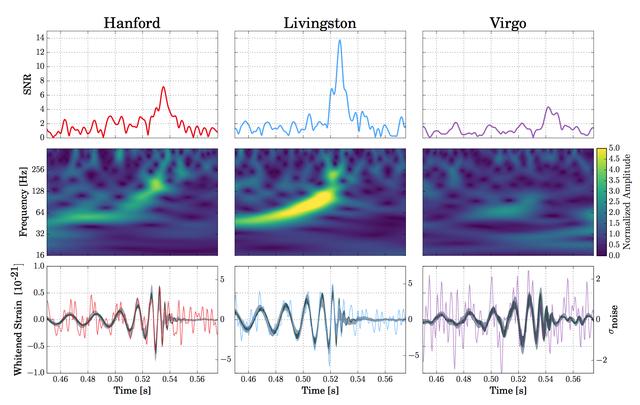 两个黑洞质量分别是30.5和25.3个太阳质量,合并后的质量约为53.2个太阳质量,也就是说,在极短的时间之内,大约有2.6个太阳质量以引力波的形式损失掉了。通过整个持续了大约0.25秒的波形振幅拟合,我们由此可以推断,此次双黑洞合并发生之处距离我们大约18亿光年。