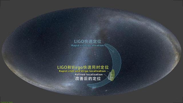 两个LIGO探测器快速空间定位的范围约为1160平方度;VIRGO加入之后,定位范围将会收缩到100平方度。如果进一步利用贝叶斯统计方法对所有可能参数进行估算,空间定位将进一步缩减至60平方度。