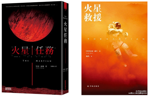 《火星救援》原著中文版,左:台湾三采公司繁体中文版,右:译林出版社简体中文版。