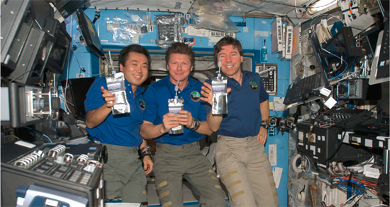 航天员正在展示国际空间站再生水回收系统的杰作—用各种废液生产的纯净