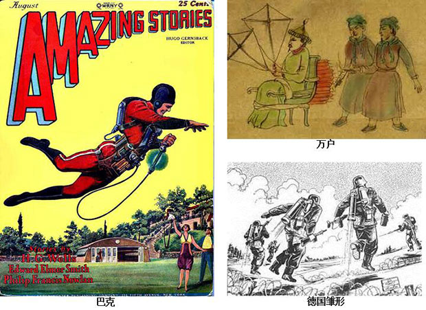 火箭喷气背包 火箭喷气背包,也叫跳带、飞带、火箭带,历史悠久。谣传我们明朝的万户,曾经手抓风筝,自缚于椅,用四十七枚大火箭发射,直接冲进了天堂。 记住“巴克(Buck)”这个名字,跟喷气背包爱好者一提,他们会把你视为同道。1928年,这个小说人物做了一期俗辣杂志的封面,让喷气背包的概念在现代首次广泛流传。 巴克的装备,和后来的火箭背包,基本一致:缚在背上,引擎中化学剂(现在常用高纯度过氧化氢)被催化反应,迅速释放大量高温高压气体,从狭小喷嘴高速喷出,产生推力,手柄操纵喷嘴,就可从容起落,升降,转向,平移。 据说,最早造出来的火箭背包,并非来自美国军方,而是异想天开的德国纳粹,雏形而已,用于跨雷区,越战壕,战后传到美国,没留下实物。
