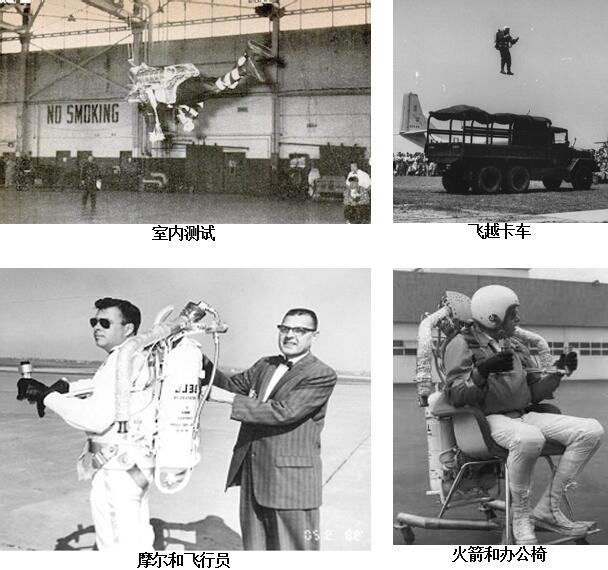再记住“温德尔•摩尔(Wendell Moore)”这个名字,跟喷气背包爱好者一提,他们会哭出来。伟大的1961年,摩尔在贝尔飞行器公司发明的火箭背包于美国尼亚加拉无保护首飞,飞了21秒,当然不是跨越大瀑布,只是机场边的草坪,然而,要知道,时至今日,所有火箭背包沿用的仍是摩尔的蓝本,续航时间也仍在30秒徘徊。不久,火箭背包见了公众,飞越一辆卡车。兴奋的贝尔公司的同仁们拿着火箭,逮着什么绑什么,包括塑料办公椅。