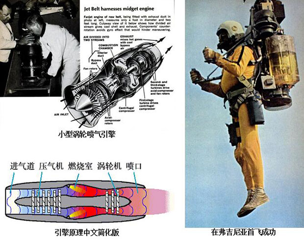 涡轮喷气背包 涡轮喷气背包,也叫喷气带,与火箭背包的区别在于:体积大些,引擎吸入并压缩空气,点燃燃料(常用煤油类),让燃气穿过涡轮。其它的,都一样,但煤油和涡轮提升了推力和续航时间——1969年,涡轮背包首飞,飞了4分半钟。