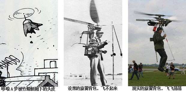 背包直升机 背包直升机与喷气背包的区别,顾名思义,在于它不用喷嘴喷气,而用旋转的桨叶。当然,也得缚在背上——像哆啦A梦那样固定在头顶,一启动,就只有一块头皮从空中飘过了。最直观的设想大概是旋翼,可惜,时至今日,这样的旋翼背包,升力和续航时间都不足道。