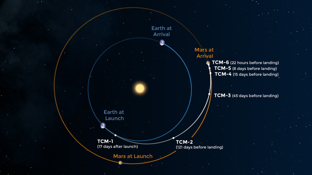 “洞察号”发射和到达时地球与火星的位置变化以及轨道调整(TCM:Trajectory Correction Maneuver 轨道修正机动 图片来源:NASA/JPL/Caltech)