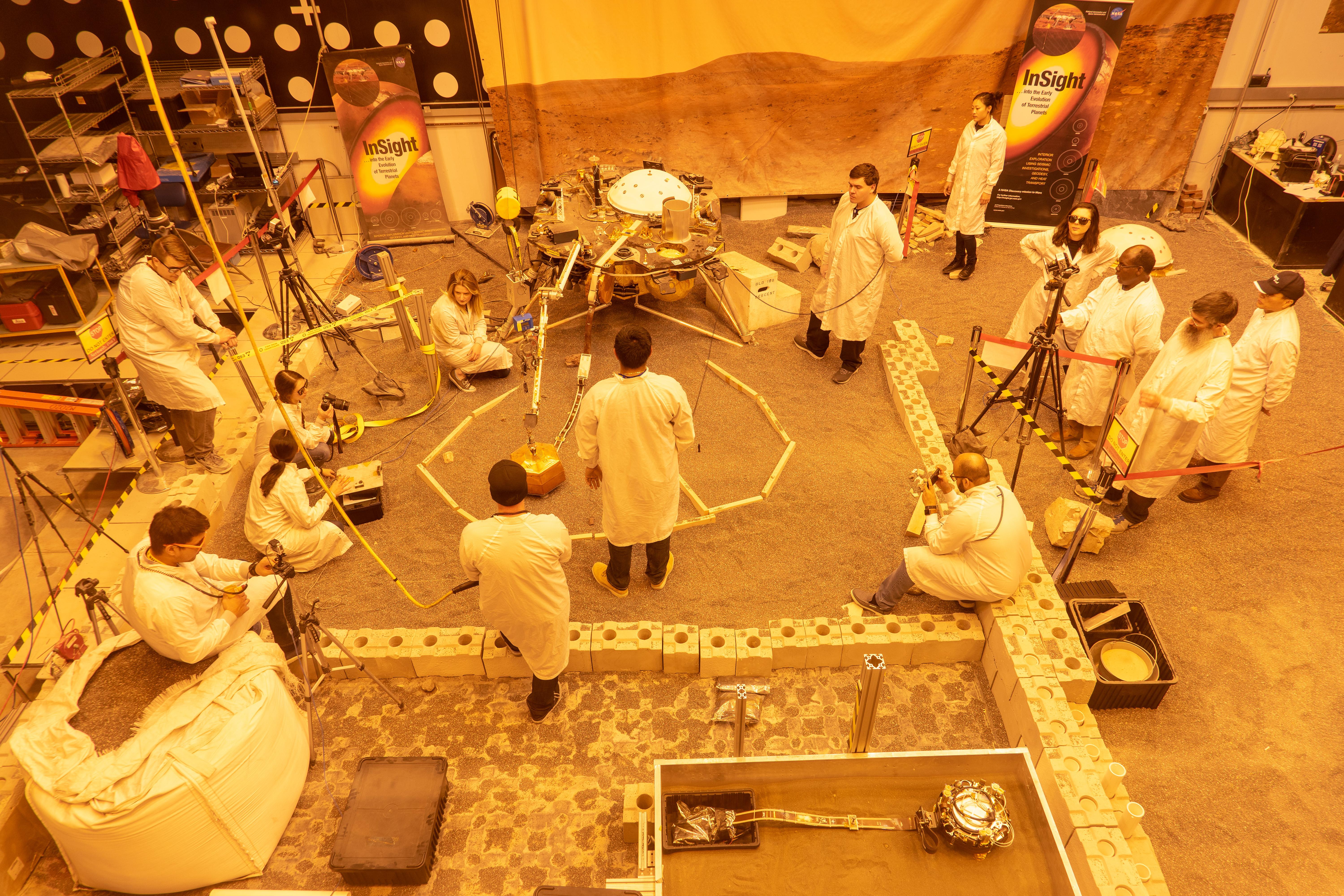加州理工学院喷气推进实验室练习部署“洞察号”仪器(图片来源:NASA/JPL/Caltech)