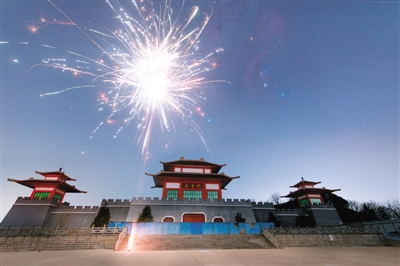 在山东省济南市武圣门,新年的烟花和“福禄寿”三星共同绽放在夜空。袭清摄