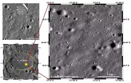 (左上)嫦娥四号降落相机的照片和LROC NAC影像的匹配;(左下)冯·卡门撞击坑位置;(右)嫦娥四号着陆区。图自:LROC/ASU,LROC WAC/NAC/haibaraemily