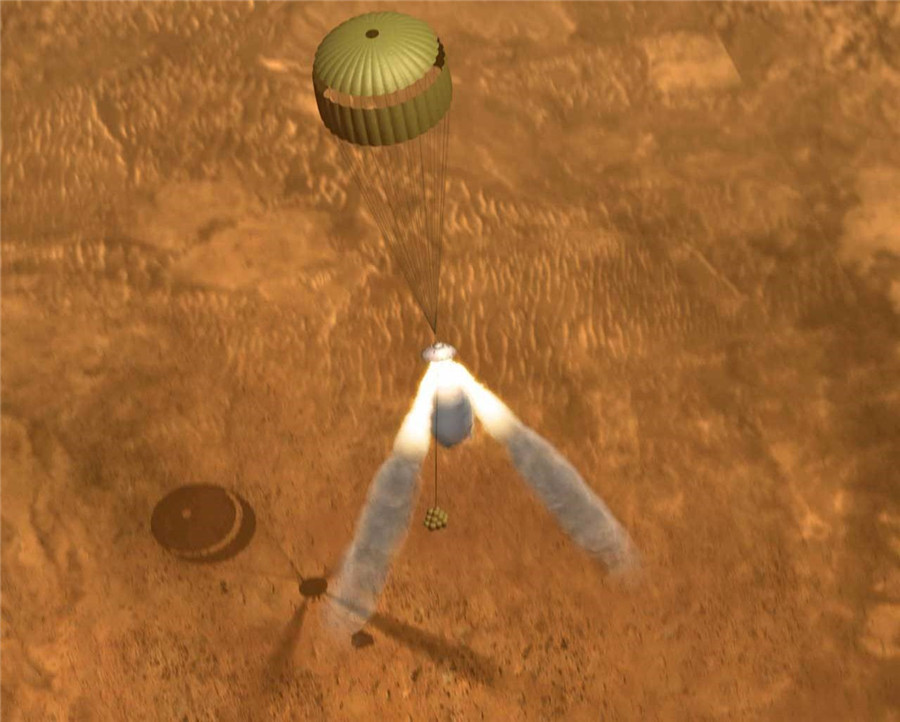火星降落从不是一件容易的事情。火星引力低于地球,存在稀薄大气,但可以像着陆地球一样,使用空气阻力摩擦和进一步降落伞结合的方式减速。由于速度较快,摩擦能产生巨大的热量会不断在探测器表面积累,达到惊人的2100摄氏度(好奇号火星车降落过程)。但是,火星大气也过于稀薄,仅有地球1%不到,它的减速作用有限,所以不可能像地球一样使用降落伞即可完成最终减速。