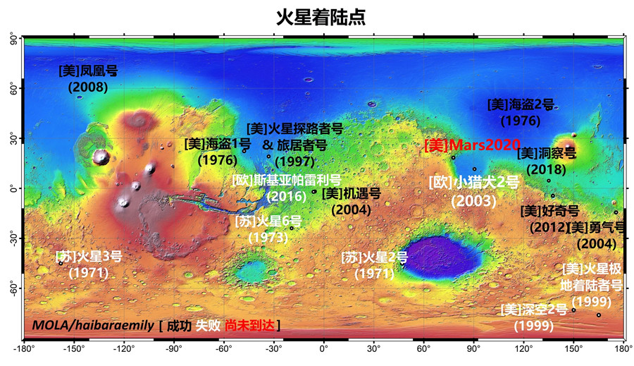 人类所有已在和将在(火星2020)火星上留下痕迹的火星着陆地点分布(图:Haibaraemily改自NASA)