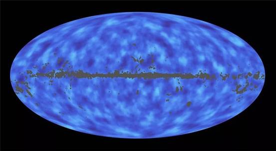 利用Plank卫星数据制作的从地球到可观测宇宙边界的质量分布图。亮的区域为高质量,暗得区域为低质量,灰色区域为受银河系阻碍无法观测的地方。(图片来源:ESA/NASA/JPL-Caltech)