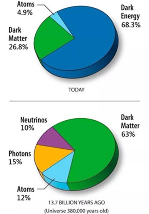 根据五年的WMAP卫星数据估算宇宙中的总能量分布(图片来源:NASA,最新的Plank卫星已有更精确的数据)