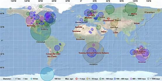 地球上目前已发现的大型陨石坑分布(不完全统计),注意圆圈大小并不是实际的陨石坑大小,但正比于实际陨石坑的大小。