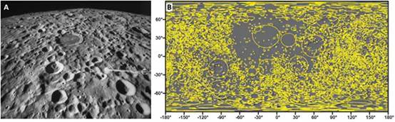 (左)典型的月球高地地貌,撞击坑遍布。来源:NASA。(右)月球上直径大于20 km的撞击坑分布。来源:参考文献[2]