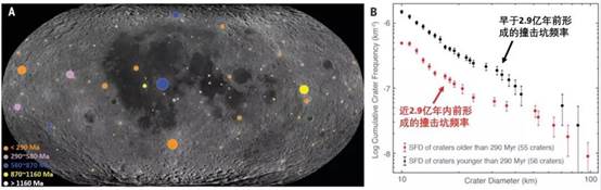在这111个撞击坑里,56个形成于近2.9亿年内,而2.9-10亿年前这7亿年里只有53个撞击坑——平均到相同的时间间隔里的话,相当于近2.9亿年里月球上的撞击坑频率是之前7亿年里的2.6倍。
