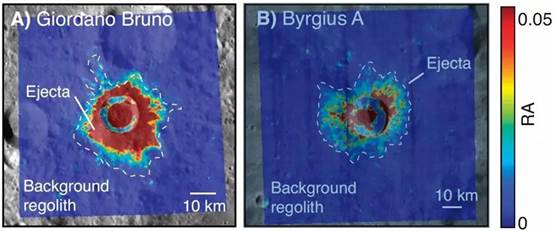 月球上Giordano Bruno和Byrgius A撞击坑通过Diviner计算的石块百分比RA。来源:参考文献[7]