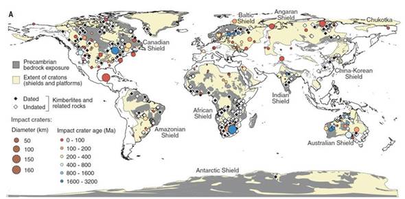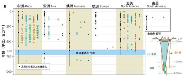 地球大陆各个地盾中的撞击坑大小、年龄和金伯利岩管分布。来源:参考文献[1]