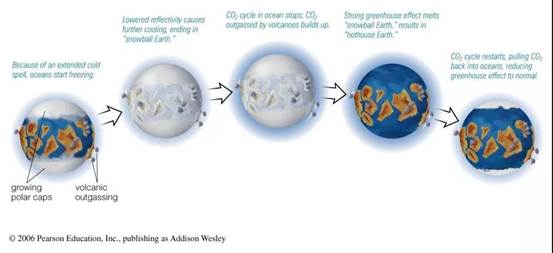 科学家们推测,曾经的地球曾经至少经历过三次全球性的冻结和解冻,那时候整个地球变成了一个“雪球”。最后一次全球冰封发生约在6亿年前。来源:2006 Pearson Educaiton, Inc