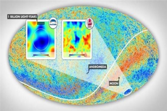 WMAP卫星探测到的宇宙微波背景辐射的一个低温区,怀疑由ISW效应引起(图片来源:wikipedia)