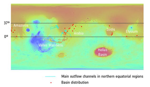 这张图片显示了众多可能与火星地下水系统有关的深陨石坑(红点),底图显示了火星的地形,红色和橙色区域海拔较低,蓝色和绿色区域海拔较高。