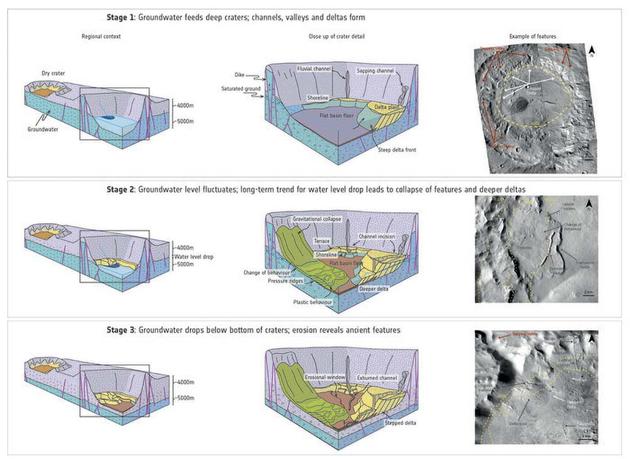 这些图片显示了火星上的陨石坑盆地如何演变,以及如何蓄积液态水的过程。