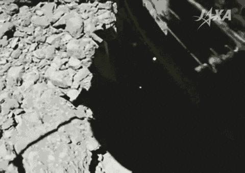 模拟打子弹的结果嘛,就是上面两个视频了。而实际射出子弹的样子,地球上的我们是无法直接看到了。不过幸运的是,隼鸟2号携带了一个专门用来跟踪采样杆的小型监视相机CAM-H,这个相机全程从采样杆顶端的(上帝)视角记录下了这场短兵相接。