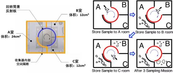 隼鸟2号的收纳器内部被分成了3部分(隼鸟号是分成2部分)。