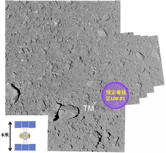 龙宫上已投下的标记球TM位置和预定着陆区L08-E1位置,着陆区范围是一个直径6米的圆形区域。来源:JAXA[6]