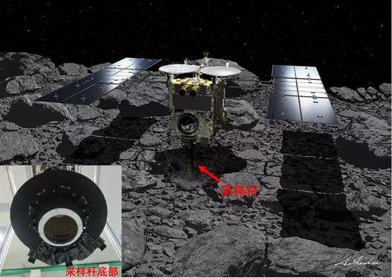 隼鸟2号的采样杆位置和底部视图。来源:JAXA[1, 3]