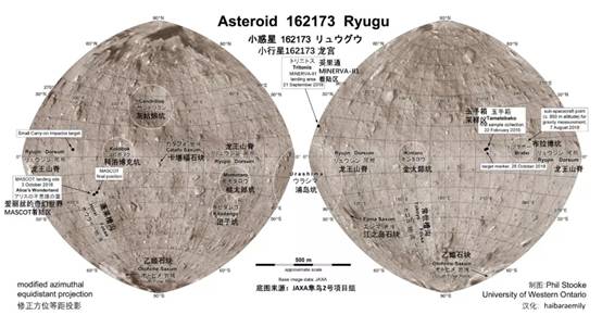 新版龙宫地图,右侧赤道处是玉手箱采样区。来源:JAXA[16]