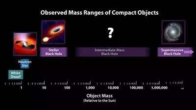 宇宙中,根据质量天文学家们将宇宙中的黑洞分成三类:恒星级质量黑洞(几十倍-上百倍太阳质量)、超大质量黑洞(几百万倍太阳质量以上)和中等质量黑洞(介于两者之间)。