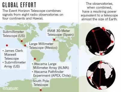 但天文学家还是想出了办法,他们利用分布在全球几大洲的8个毫米波望远镜组成干涉阵列(即事件视界望远镜EHT),阵列的基线长度和地球大小相当,角分辨率可达几十微角秒,因此具备对银河系中心黑洞和射电星系M87中心黑洞视界面附近区域进行成像的能力。