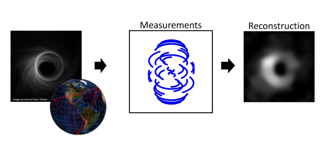 事件视界望远镜(EHT)团队模拟的黑洞附近照片及其测量和重构过程 | 图片来源:https://eventhorizontelescope.org/science