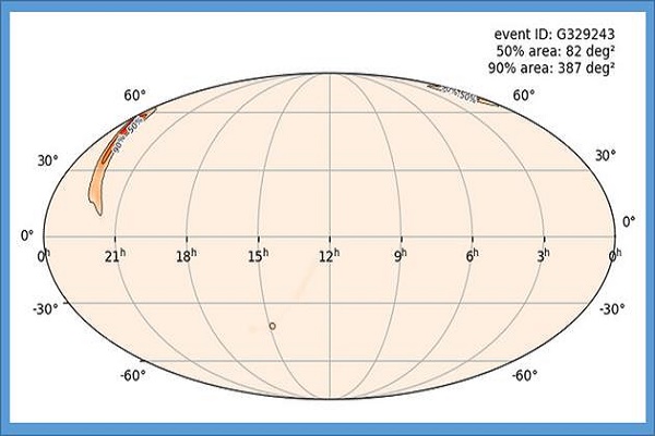 探测到的引力波信号源所在的天空区域。该区域横跨387平方度,相当于2000个满月,大致蜿蜒穿过天空北半球的仙后座、蝎虎座、仙女座和仙王座