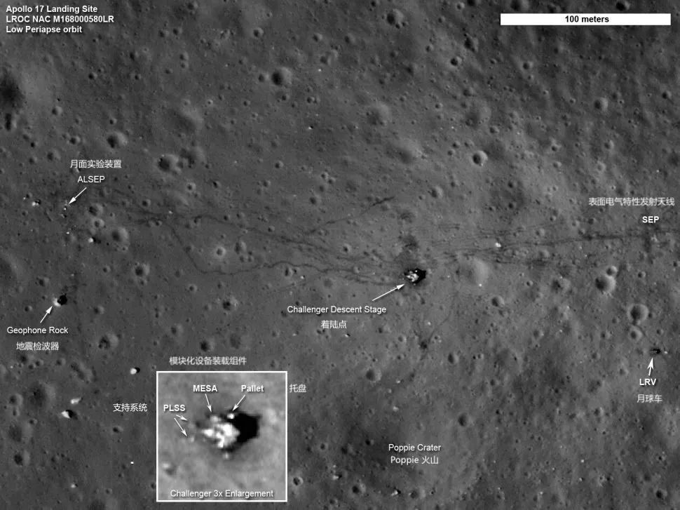 LRO 拍摄的阿波罗17号着陆点的图片 :能够看到宇航员留下的路径,着陆点,月球车,火山,以及遗留下来的设备等。图片来源:NASA